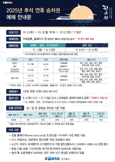 - 예매 시기: 8월 셋째~넷째 주 (코레일·SRT 별도 공지)