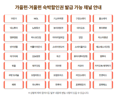 - 가을/겨울 공통: 여기어때, 야놀자, 11번가, 아고다, 인터파크투어, 티몬, 쿠팡 등 다수 참여